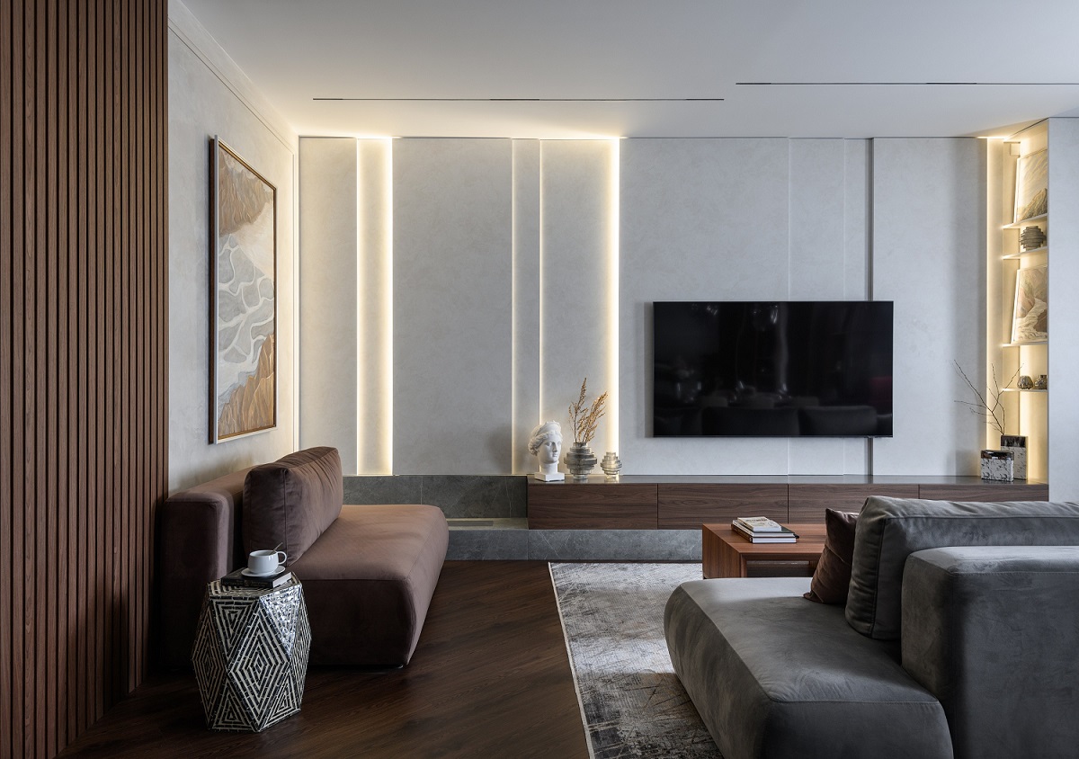 Такой ход сыграл на то, чтобы зона отдыха стала более тёплой и живой. За это здесь отвечает золотая перегородка и фурнитура, тёплая подсветка и кварцевый ламинат Дуб Калифорния на полу.