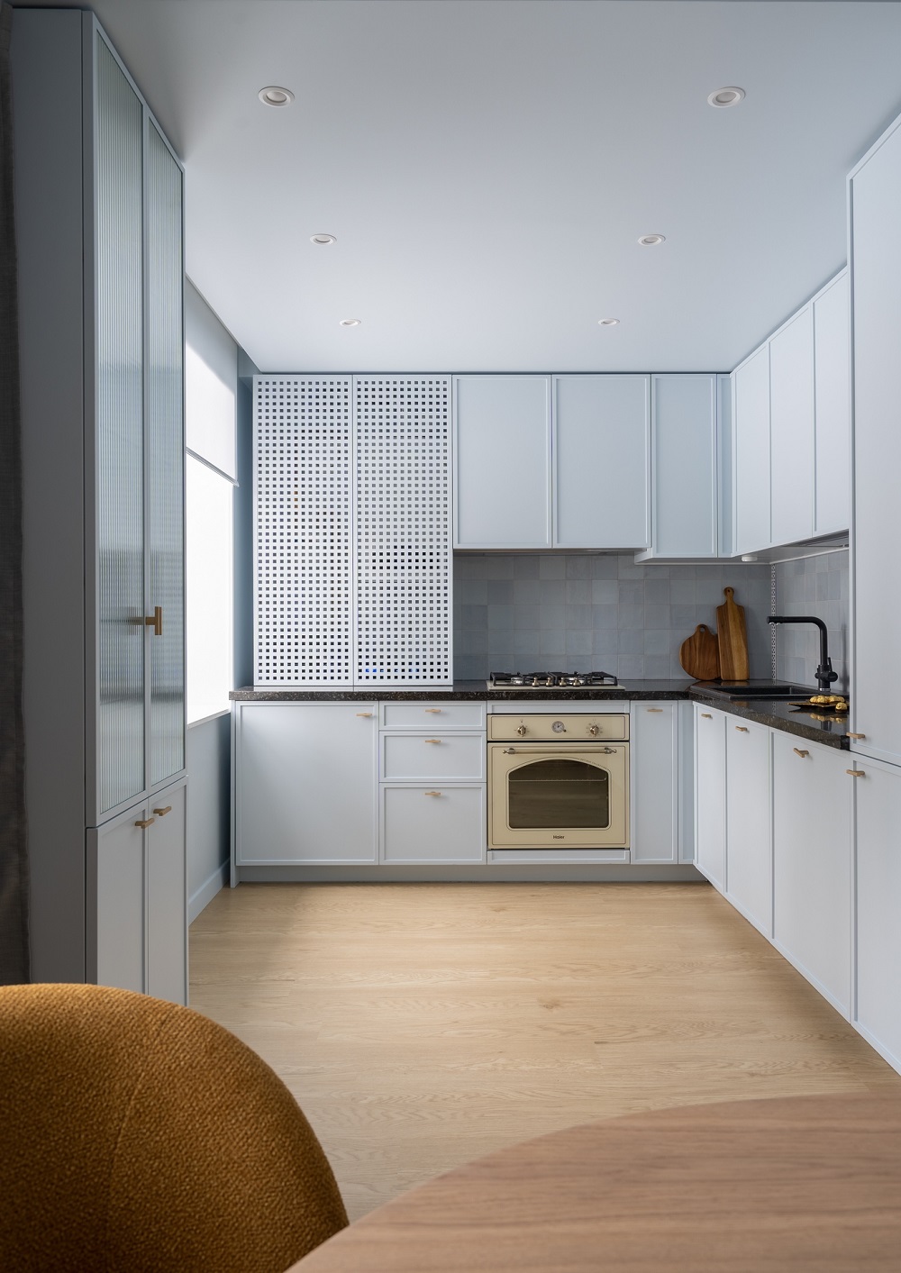 В этом проекте дизайнер «Квартирного вопроса» Татьяна Казанцева активно работала с цветом и светом, чтобы создать уникальное тёплое пространство со сложной архитектурой, но простой эргономикой.